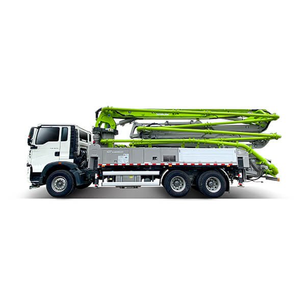 Máquina de bombeamento de concreto sem caminhão, com tecnologia de duplo pistão hidráulico com diâmetro de 230mm e curso de 1.650mm, capacidade máxima de produção com vazão de 120m3/h de concreto; pressão máxima em concreto de 66bar ou 6,6MPA com circuito hidráulico aberto; com um máximo de 30 ciclos/min; com acionamento por tecnologia de tomada de força (PTO); alcance vertical máximo de 31,4m e distância horizontal máxima de 27,4m. 4 seções de lança, a 1ª seção com um comprimento de 7.940mm e um ângulo de abertura de 90 graus, a 2ª seção com um comprimento de 6.350mm e ângulo de abertura de 180 graus, a 3ª seção com um comprimento de 6.360mm e um ângulo de abertura de 240 graus e a 4º seção com comprimento de 6.750mm e ângulo de abertura de 230 graus; ângulo de rotação dos braços de ±270° graus; tubo de bombeamento de concreto com mastro de distribuição de dupla camada de alta durabilidade. Montado em chassi sem caminhão